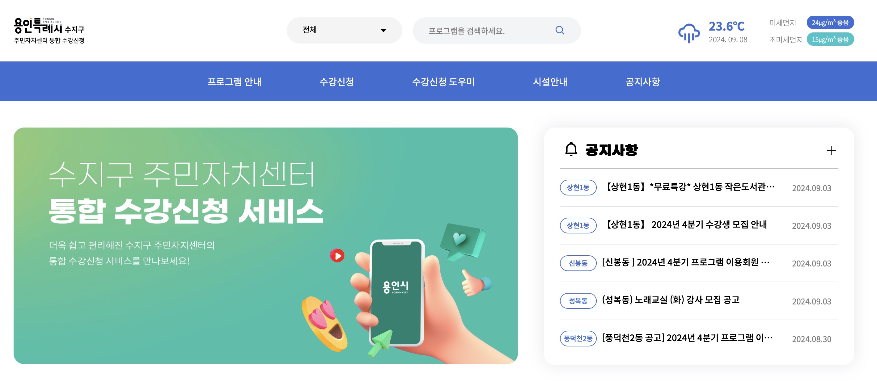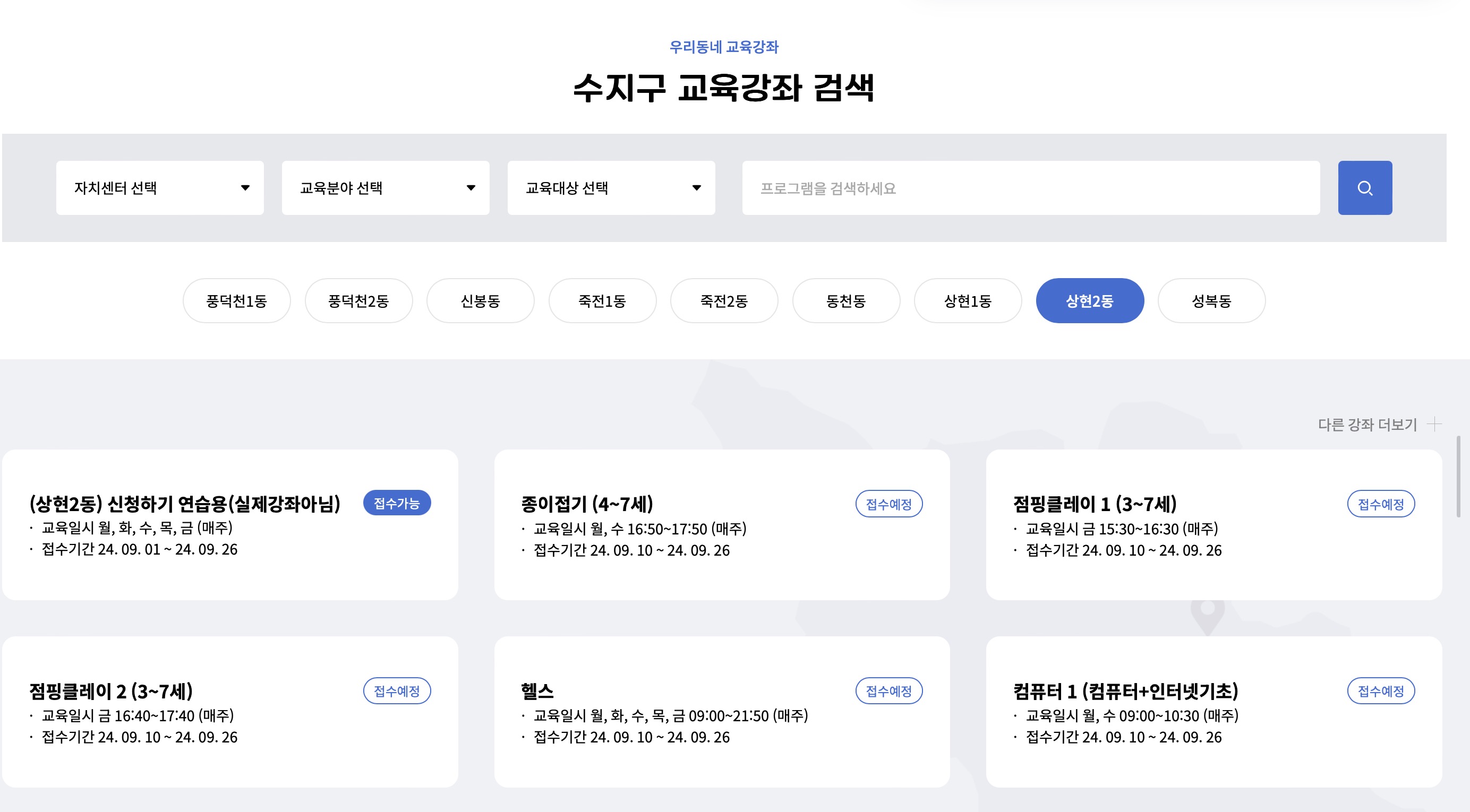 상현2동 주민자치센터 프로그램에 수강신청하는 방법. * 용인시 처인구 기흥구 수지구 거주하시는 각 동별로 수강신청 페이지가 다르니 참고하시기 바랍니다.