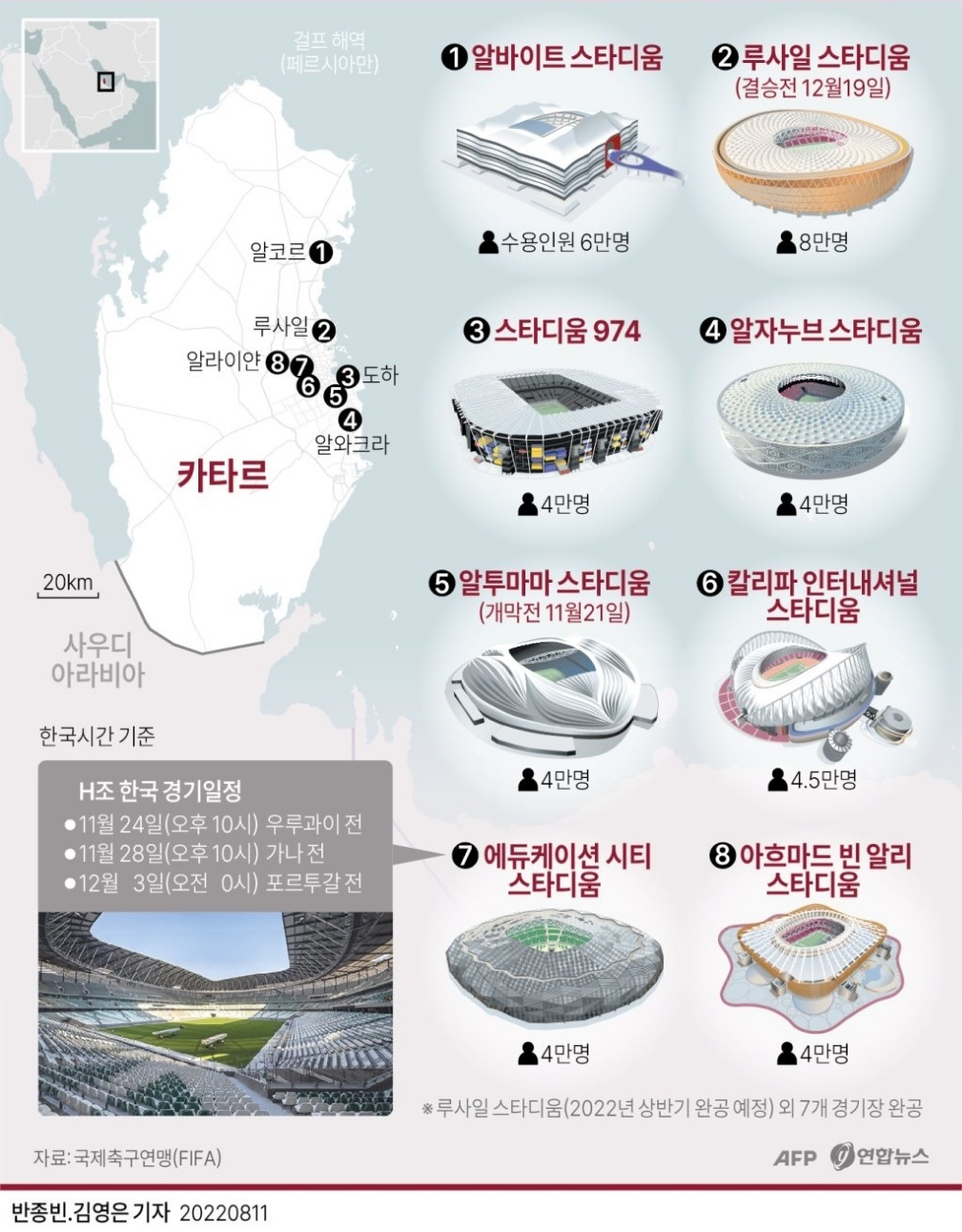 알바이트 스타디움, 루사일 스타디움 (결승전), 스타디움 974, 알자누브 스타디움, 알투마마 스타디움 (개막전), 칼리파 인터내셔널 스타디움, 에듀케이션 시티 스타디움, 아흐마드 빈 알리 스타디움