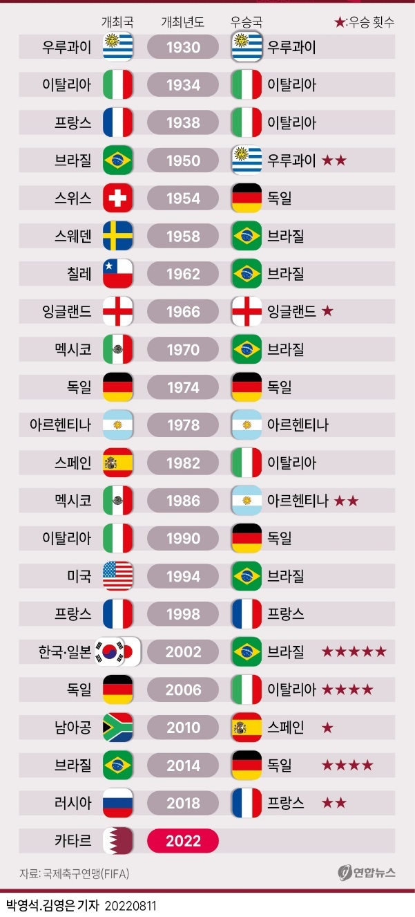 1회 우루과이 대회를 시작으로 22회째 대회인 월드컵.