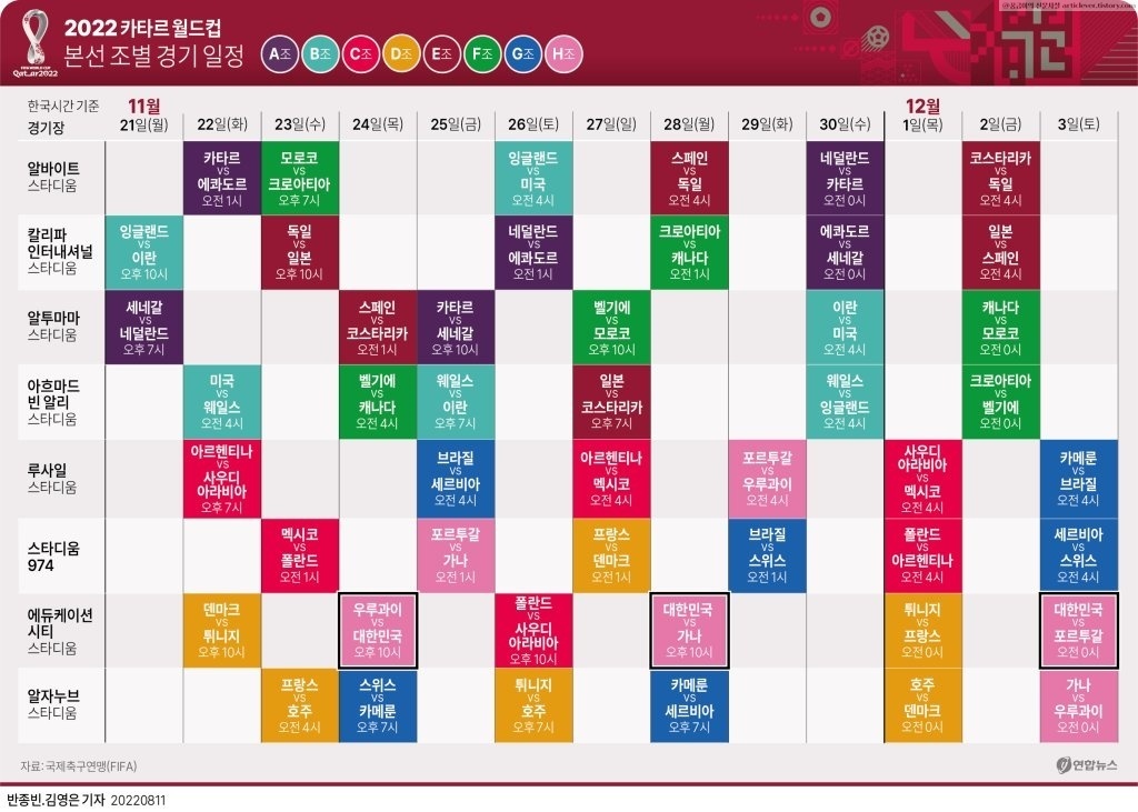 2022년 카타르월드컵이 3주앞으로 다가왔습니다. 한국시간으로 11월 21일 월요일 오후 10시부터 세네갈과 네덜란드전을 시작으로 12월 3일 까지 조별리그 일정을 소화하게 됩니다. 21일과 29일 양일에만 2경기씩 치러지고 남은 일정은 모두 하루에 4경기를 소화하게 됩니다. 카타르월드컵 조별리그 일정과 경기 중계 시간을 한국시간 기준으로 안내드립니다.