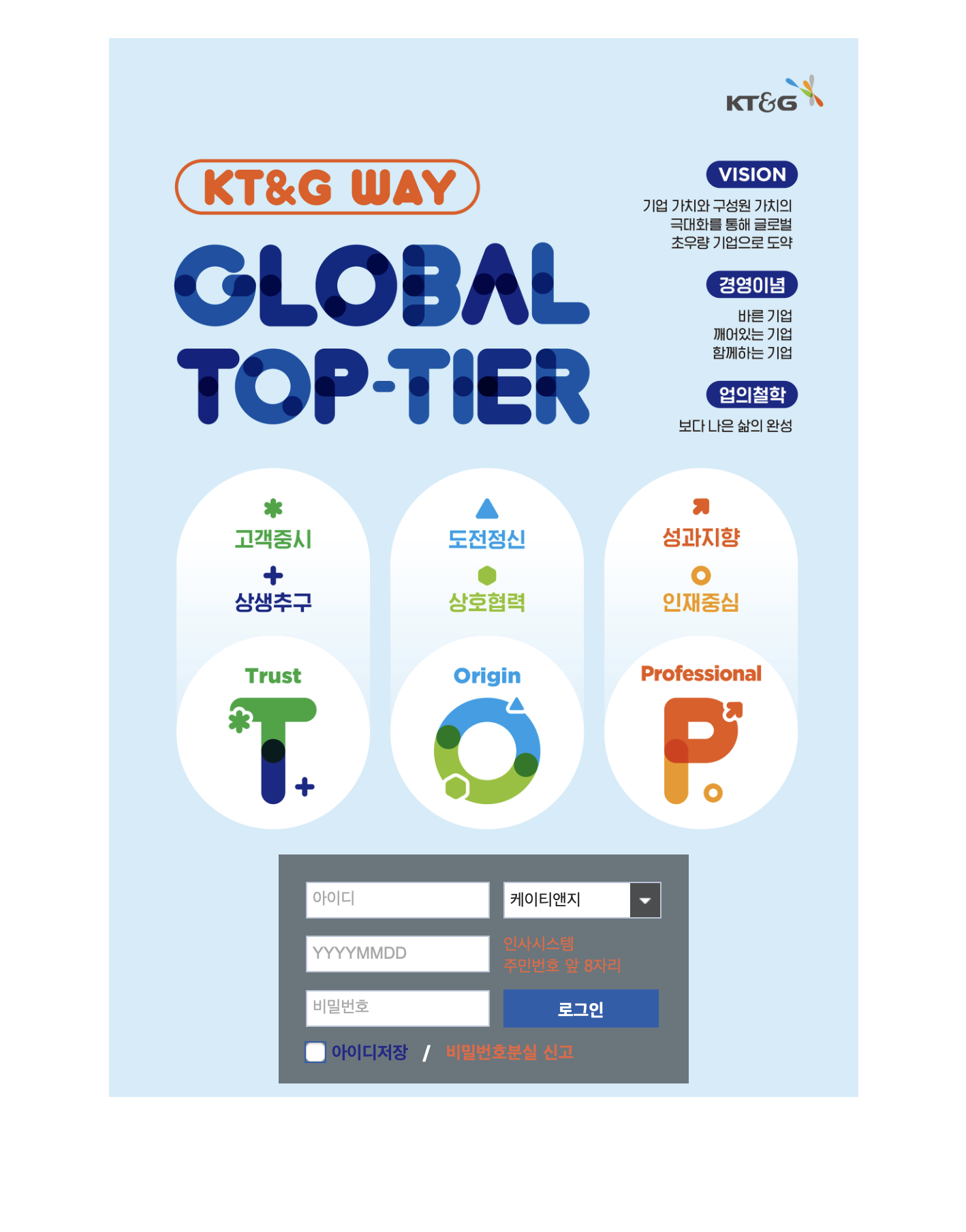 - 자격 증명 입력: KT&G에서 제공한 사용자 ID와 비밀번호를 입력합니다.